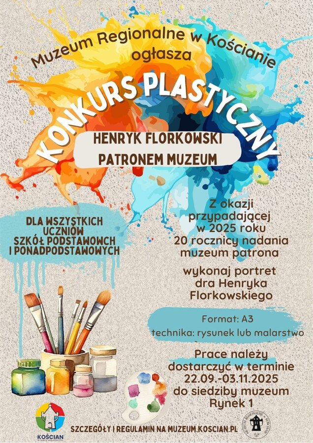 Z okazji przypadającej w 2025 roku 20-stej rocznicy nadania muzeum imienia patrona, ogłaszamy konkurs, który skierowany jest do uczniów szkół podstawowych oraz uczniów szkół ponadpodstawowych z Kościana i okolic. Zadaniem konkursowym jest wykonanie portretu dra Henryka Florkowskiego, przedstawiającego go jako lekarza, regionalistę lub społecznika, na podstawie zdjęć udostępnionych na stronie internetowej muzeum.