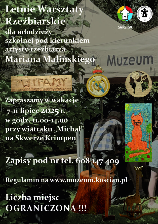 Zapraszamy uczniów klas 6-8 szkół podstawowych i szkół średnich do wzięcia udziału w Letnich Warsztatach Rzeźbiarskich. Tegoroczna edycja odbędzie się w dniach 7-11 lipca 2025 r. w Wiatraku „Michał” na Skwerze Krimpen w Kościanie, pod kierunkiem artysty-rzeźbiarza Pana Mariana Malińskiego. Zajęcia będą w godzinach 11:00-14:00.