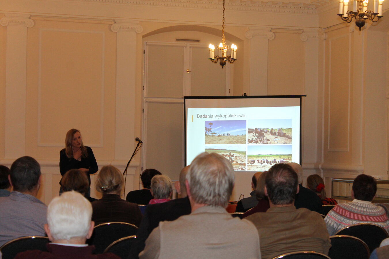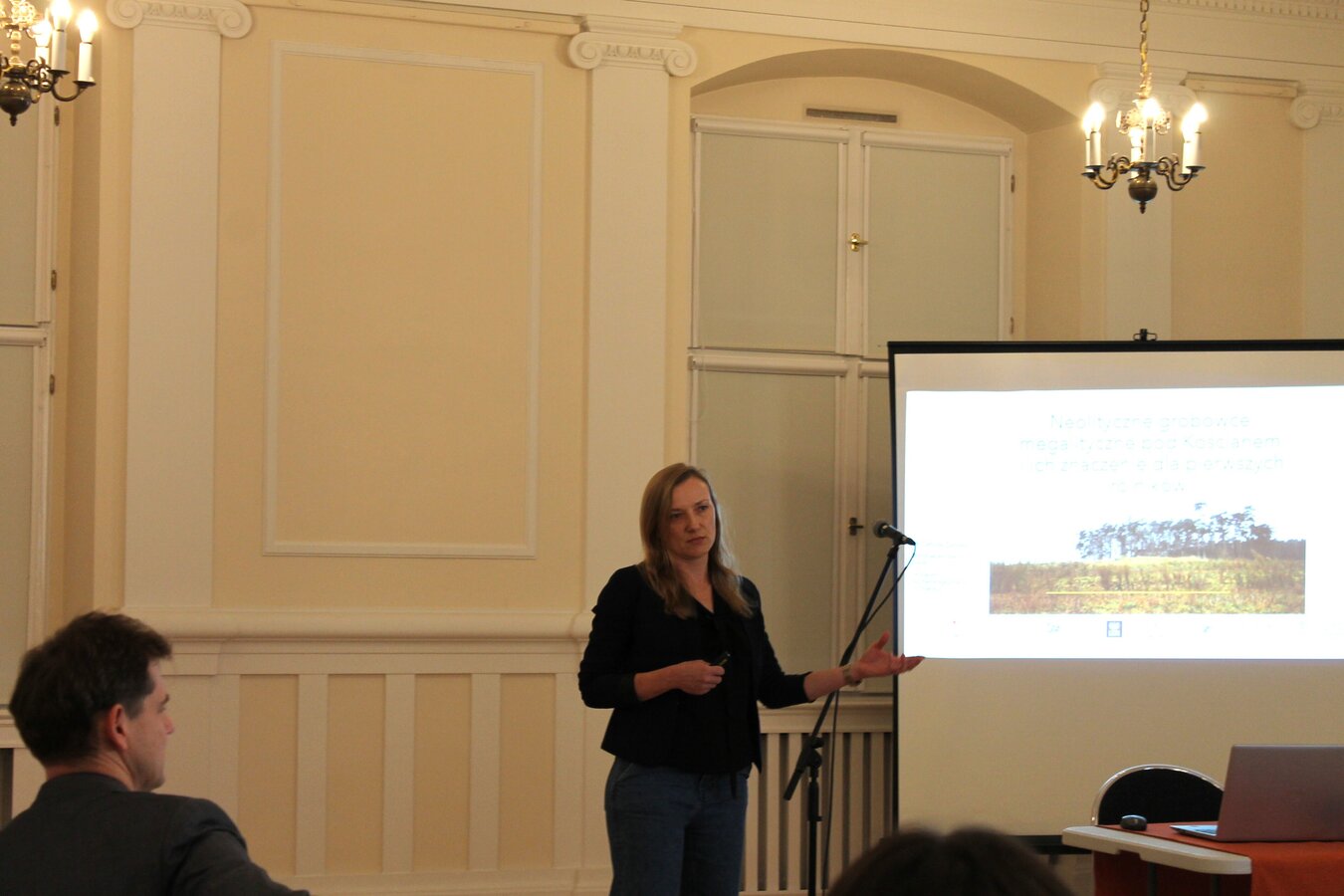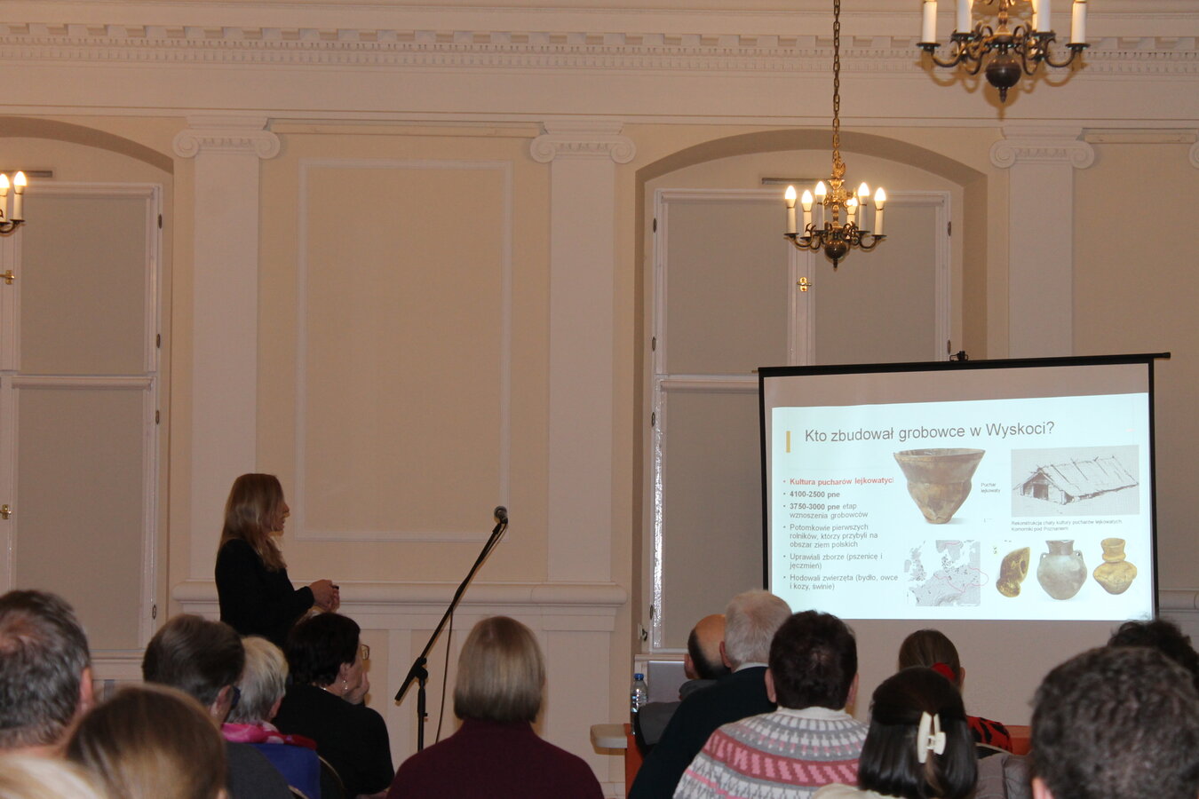 O godz. 18.00 Pani Doktor Danuta Żurkiewicz opowiedziała o grobowcach megalitycznych, które odnaleziono na stanowisku i o badaniach, które do tego doprowadziły. Przedstawiła również różne metody badawcze: nieinwazyjne (badania powierzchniowe, magnetometryczne, detekcja metali) oraz inwazyjne, czyli wykopaliska. Porównała grobowce w Wyskoci z pozostałymi grobowcami typu kujawskiego z terenu Polski, a także z megalitami w Europie i na świecie. Wyjaśniła również, jaka kultura neolityczna zbudowała te grobowce i czym się charakteryzuje, a także kto mógł być pochowany w tego typu grobowcu. Licznie przybyły osoby zainteresowane tematem, w tym archeolodzy i studenci, którzy odbywali praktyki na stanowisku w Wyskoci.