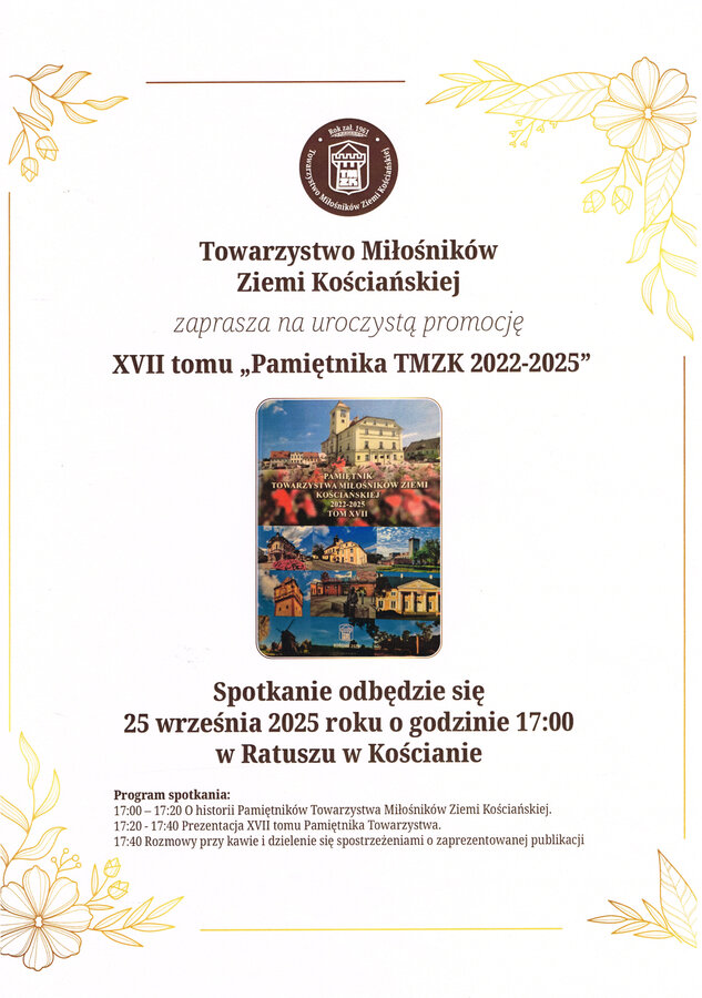 Towarzystwo Miłośników Ziemi Kościańskiej serdecznie zaprasza na promocję najnowszego, XVII tomu "Pamiętnika TMZK 2022-2025"