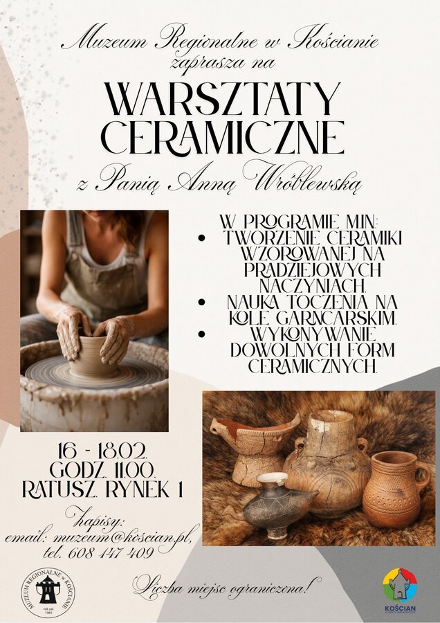 Muzeum Regionalne w Kościanie zaprasza na warsztaty ceramiczne dla dzieci i młodzieży, w ramach ferii zimowych, które odbędą się w dniach 16-18.02., o godz. 11.00 w Ratuszu.