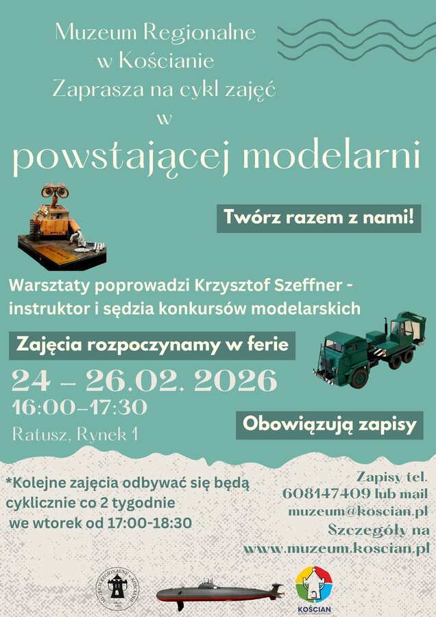 Muzeum Regionalne w Kościanie zaprasza dzieci i młodzież na warsztaty modelarskie tworzenia modeli kartonowych w ramach ferii zimowych, które odbędą się w dniach 24-26.02., o godz. 16.00-17.30 w Ratuszu.