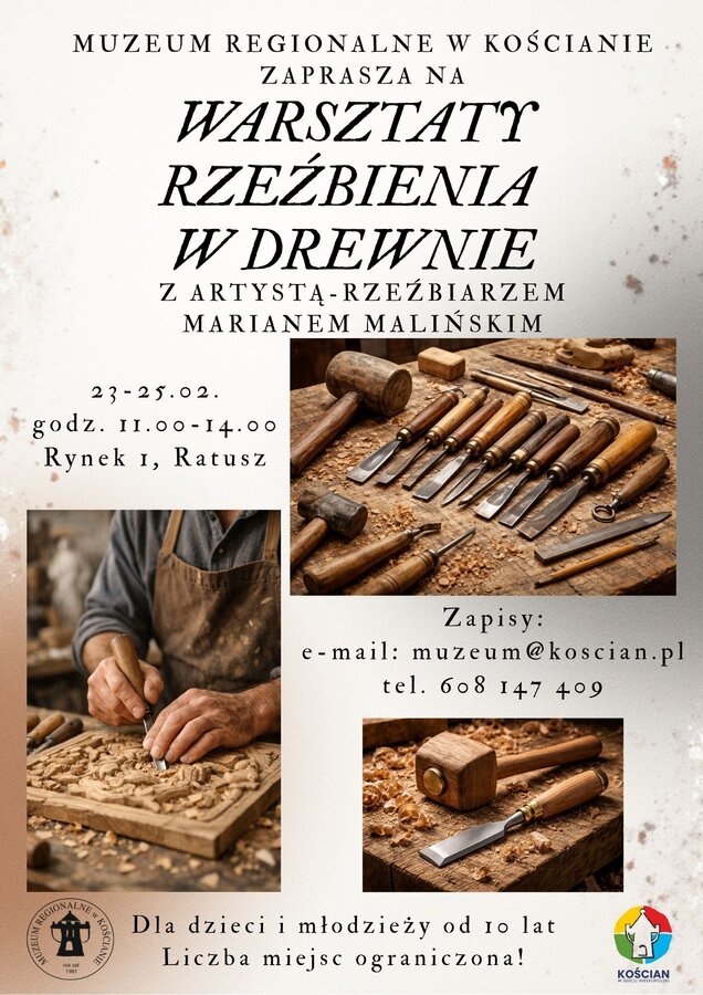 Muzeum Regionalne w Kościanie zaprasza dzieci i młodzież na warsztaty rzeźbienia w drewnie w ramach ferii zimowych, które odbędą się w dniach 23-25.02., o godz. 11.00-14.00 w Ratuszu.