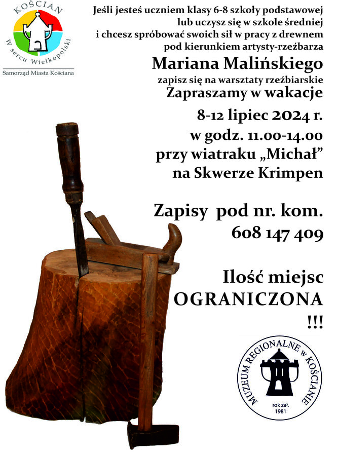Zapraszamy uczniów klas 6-8 szkół podstawowych oraz szkół ponadpodstawowych z powiatu kościańskiego do wzięcia udziału w letnich warsztatach rzeźbienia w drewnie. Tegoroczna edycja odbędzie się w dniach 8-12 lipca w wiatraku "Michał" na Skwerze Krimpen w Kościanie, pod okiem artysty-rzeźbiarza, Pana Mariana Malińskiego. Zajęcia będą w godzinach 11.00-14.00.